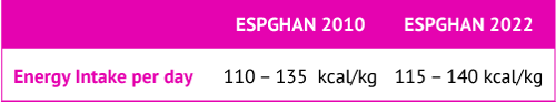 Energy is crucial for preterm infants. Premature neonates can have an energy-deficient state due to illness, neurodevelopmental energy requirements, drops in blood oxygen levels, and the possibility of stressful stimuli. Failure to correct energy deficiency in premature infants may lead to adverse effects such as neurodevelopmental delay and negative long-term metabolic and cardiovascular outcomes. The old and new recommendations by ESPGHAN are as follows: