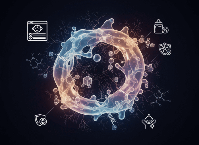 Dr. Hinde believes that milk should not only be viewed as “just calories and protein”, but rather as a bioactive, living fluid tailored by evolution over 200 million years. This is evident in milk’s role as a signal, which facilitates a continuous physiological dialogue between mother and infant. As an example, the hormone oxytocin in milk not only aids lactation but also promotes bonding between mother and infant, and reduces stress, with cortisol levels helping calibrate the infant’s own stress-response system.3 Other studies have shown that when a baby is sick, their body sends signals that cause the white blood cell count (leukocytes and macrophages) in their mother’s milk to surge, creating a customized immune boost. When the illness passes, these levels return to normal.4