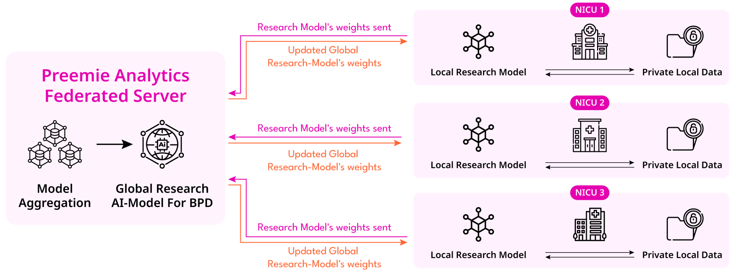 2. Weight Sharing: Instead of sending patient data, the NICU sends “model updates” (mathematical gradients) to Preemie’s central cloud.